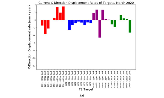 The most recent rates of displacement of each target are shown in Figure 9a–c. The ship is currently moving most in the Z direction across all four decks. In addition, the most recent displacement rate is highest in the upper two decks and increases moving up the ship. Since the ship is predominantly dry, according to the moisture content recordings, the most recent limited movement is from other structural considerations, such as interconnectivity, or lack of, within the ship.