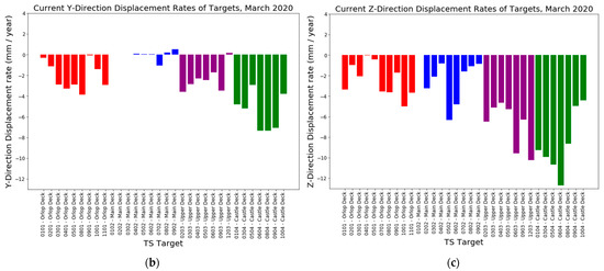 Most recent (2020) displacement rates in the (a) X, (b), Y and (c) Z directions. The colour of the bars denotes the deck on which the target is located: red—orlop, blue—main, purple—upper, green—castle.