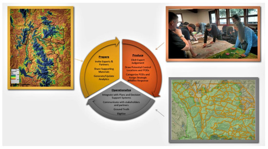 General workflow of the potential wildland fire operational delineation (POD) development process, with figure insets for each stage displaying real-world examples of generated potential control locations (PCL) layers (prepare), manager workshops (produce), and final POD maps (operationalize) [41].