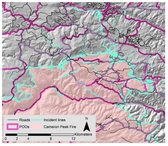 A range of advanced decision support tools were deployed during the incident, including updated PCL maps provided by the agency’s Risk Management Assistance program [56]. Additionally, some of the co-authors were involved in assessing and interpreting PCL values for various road segments and POD edges to aid incident response decisions such as locating contingency lines. In future research we plan to examine the utility of forest roads, PCLs, and PODs in supporting incident management on the Cameron Peak Fire, which will necessitate extensive collection and analysis of spatial incident data along with interviews with local managers and out-of-area Incident Commanders (see [57,58]). Preliminary analysis indicates some alignment of the fire perimeter with roads (e.g., Figure 5). Further, preliminary analysis indicates strong alignment of roads with intended control features for indirect and contingency line. We interpret these results to underscore the importance of indirect tactics for containing large fires and the associated utility of pre-identifying suitable PCLs.