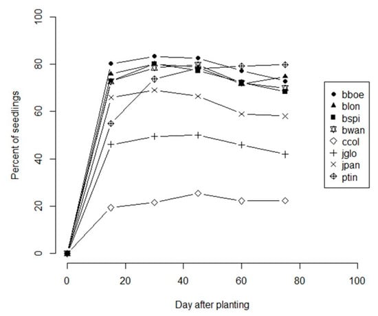 A high number of seedlings was obtained 15 days after planting. Except for P. tinctorius (ES), mortality was observed from 60 days onward for the seedlings of C. collinum (ES), B. boehmii, B. longifolia, B. spiciformis, B. wangermeana, J. globiflora and J. paniculata (LS). This mortality is probably due to insect herbivory (field observations) rather than to drought, which is a major cause of seedling mortality []. In our study, 45 days after planting corresponds to the middle of the rainy season, i.e., the month of February [].
