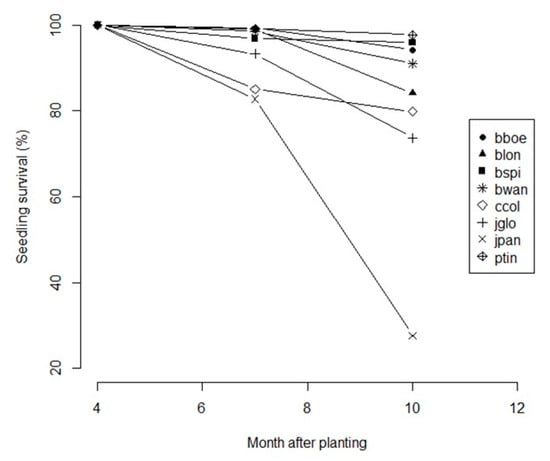 A significant difference in survival was observed in age (F (2. 80) = 87.29, p < 0.0001) and among species (F (7. 40) = 15.74, p < 0.0001). Given their interaction, temporal responses depended upon species and vice versa (F (14, 80) = 27.2, p < 0.0001). Seedling survival was greater than 73.35% (SD = 21.84), and there was no significant difference between 4, 7 and 10 months after planting for six of the eight species. Yet, seedling survival of J. globiflora and J. paniculata significantly differed between 10 and 7 months and 10 and 4 months (Figure 2). Ten months after planting (September 2011: hot, dry season), seedling survival of J. paniculata significantly decreased drastically (average = 36.8%, Figure 2).