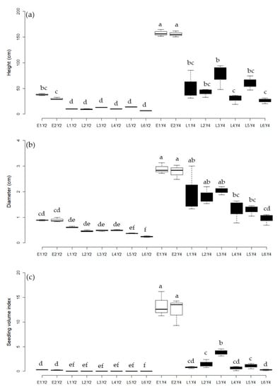 Seedling growth of 8 tree species of woodland. (a) Height (cm), (b) diameter of the stem measured at the root collar (RCD, 2 years) and at 10 cm above the soil surface (4 years) (cm) and (c) seedling volume index (cm3). E and L: early and late successional species, respectively. Y2 and Y4: 2 and 4 years after planting, respectively. E1: C. collinum and E2: P. tinctorius (ES); L1: B. boehmii, L2: B. longifolia, L3: B. spiciformis, L4: B. wangermeana, L5: J. globiflora and L6: J. paniculata (LS). N = 3 replicates (subplot) and 3 seedlings per replicate and per species Box and whisker plots summarize the 25th, 50th (median line) and 75th percentiles defining the box, together with the 10th (lower whisker) and 90th (upper whisker) percentiles, for the responses for each species. Letters above the boxplots indicate mean differences with respect to age and species, according to post-hoc Tukey HSD tests (p < 0.05).