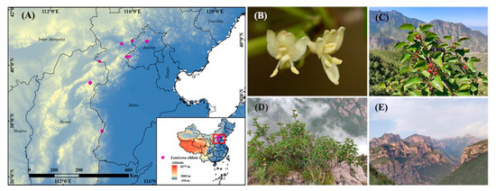 Lonicera oblata Hao ex Hsu et H. J. Wang (Caprifoliaceae) is a critically endangered deciduous shrub endemic to North China that inhabits highly fragmented and isolated areas of the Taihang and Yan mountains [50,51]. According to previous literature records [50,51,52] and our field observations, living individuals only occur in a few areas of North China, including Beijing, Hebei, and Shanxi provinces (Figure 1A). Moreover, the regeneration ability of population is weak under natural conditions, the population primarily consists of old individuals, and seedlings are rarely observed. Because of its small population, extremely narrow distribution and specific habitat requirements, L. oblata is listed in the national conservation plants list in China (http://www.forestry.gov.cn/main/4461/20200709/115401336526615.html). The locations of L. oblata are difficult to access because populations are limited to near or on the tops of cliffs (Figure 1D,E); consequently, the geographical distribution of the species is poorly known.