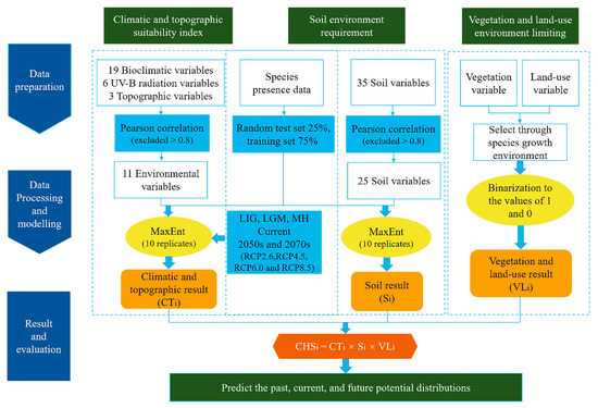 Finally, based on the prediction model of climatic, UV-B radiation and topographic variables and considering the effect of soil as well as vegetation and land-use conditions following previous studies (e.g., [61,62,63,64]), we built the CHS model to assess the comprehensive suitable distribution of L. oblata (Equation (1)):