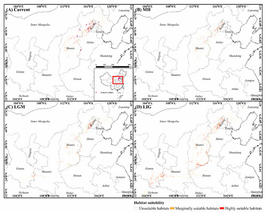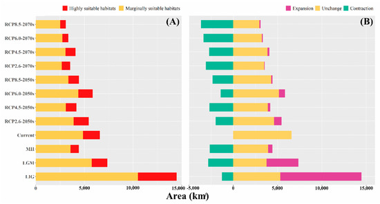 Under the three paleoclimate periods, our result of the LIG indicated that the suitable habitats of L. oblata were mainly located from southwest to northeast China that including Sichuan, Gansu, Shaanxi, Henan, Shanxi, Hebei, Beijing, and Liaoning (Figure 3D); the area of suitable habitats (10,483.32 km2 and 3974.39 km2 of the marginally suitable and highly suitable areas, respectively, accounting for 14,457.71 km2) was greater than the area of suitable habitats of the current distribution (Figure 4A and Table S6). The original suitable habitat area of Sichuan and Gansu decreased significantly, and the suitable habitats in Shaanxi and Henan have been completely lost in modern times (Figure S1A,D). In total, there was 9147.47 km2 (63.27%) area expansion in the LIG than there is now (Figure 4B and Table S7). Compared with the LIG, the suitable habitats during the LGM changed slightly in location (Figure 3B,D and Figure S1B,D), but reduced by half in area which was 7360.65 km2 (5747.76 km2 and 1612.89 km2 of the marginally suitable and highly suitable areas, respectively), which was similar to the area of suitable habitats predicted by the current climate scenario (Figure 4A and Table S6). Furthermore, the suitable habitats in the MH showed a significant change in location and a great reduction in size compared with LIG, resulting in a predicted location more similar to the current climate scenario (Figure 3A,B,D). The marginally suitable and highly suitable areas in the MH were 3560.19 km2 and 859.79 km2, respectively, accounting for 4419.98 km2 (Figure 4A and Table S6).