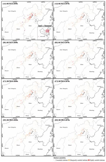Of future global warming scenarios, our model prediction results indicated that the potential distribution area of L. oblata would decrease in eight different climate scenarios. Under four low levels of greenhouse gas emission scenarios, the suitable habitats were predicted to increase by 840.96 km2 (15.44%) by RCP2.6-2050s, mainly in northeastern Hebei, Beijing, and southwestern Liaoning, but to lose suitable habitats by 1981.37 km2 (36.38%), mainly in northeastern Sichuan, southeastern Gansu, Shanxi, and Hebei (Figure 4B and Figure S2(A1) and Table S7). By RCP2.6-2070s, the range of suitable habitats would only increase by 47.52 km2 (1.34%), mostly in scattered locations in northeastern Hebei and southwestern Beijing, but that 3085.91 km2 (86.99%) of suitable habitats would be lost (Figure 4B, Figure S2(A2) and Table S7). Compared with the RCP2.6 climate scenarios, the suitable habitat area of Beijing would be lost under RCP4.5 climate scenarios; expansions of only 275.24 km2 (6.60%) and 211.59 km2 (5.18%) were predicted in northeastern Hebei and southwestern Liaoning compared with modern times by the 2050s and 2070s, respectively (Figure 4B, Figure S2(B1,B2) and Table S7). Under high levels of greenhouse gas emission scenarios of RCP6.0 and RCP8.5, there were no significant changes in suitable habitats of L. oblata compared with that of RCP2.6 and RCP4.5 by the 2050s (Figure 4 and Figure 5 and Tables S6 and S7). However, the suitable habitats decreased dramatically to 3345.91 km2 and 3623.84 km2 under RCP6.0-2070s and RCP8.5-2070s, respectively (Figure 4B and Table S7). Overall, by comparing the eight future periods to the present time, the area of suitable habitats for L. oblata was ecologically stable from the northern Taihang Mountains to the southern Yan Mountains in Beijing.