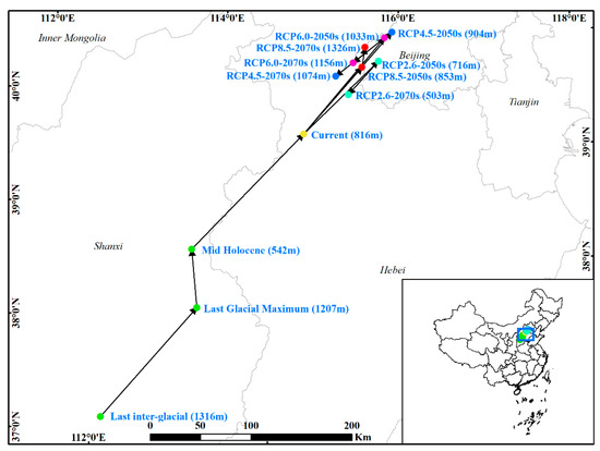 The current habitat centroid position of L. oblata represented by the yellow dot was estimated to be in central Hebei (39.3661° N, 114.7490° E). During the three paleoclimate periods (green dots), the habitat centroid of the LIG was in southwestern Shanxi (37.0331° N, 112.1550° E) and then shifted northeastward to 37.9262° N, 113.3410° E during the LGM and to 38.4423° N, 113.3400° E during the MH. Under the low-concentration greenhouse gas emission scenarios, the centroid was predicted to migrated to Beijing (39.9368° N, 115.7030° E) under RCP2.6-2050s and finally shifted to North Hebei in 2070s (39.6731° N, 115.3150° E) (cyan dots); it migrated from Beijing (40.1804° N, 115.8990° E) under RCP4.5-2050s to North Hebei in 2070s (39.8459° N, 115.1910° E) (blue dots). Under the high-concentration greenhouse gas emission scenarios, the centroid shifted to the border of Hebei and Beijing (40.1385° N, 115.8050° E) under RCP6.0-2050s, then shifted to North Hebei (39.9479° N, 115.4080° E) in 2070s (purple dots); it migrated from Beijing (39.9010° N, 115.5060° E) under RCP8.5-2050s to the border of Hebei and Beijing (40.0731° N, 115.5660° E) in 2070s (red dots). Generally, the centroid of suitable habitats for L. oblata moved toward the northeast from southwest Shanxi to the border of Hebei and southwest Beijing from the past to the future period; however, there was no significant correlation of the centroid shift observed between the low and high concentrations of greenhouse gas emissions (Figure 6 and Table S8).