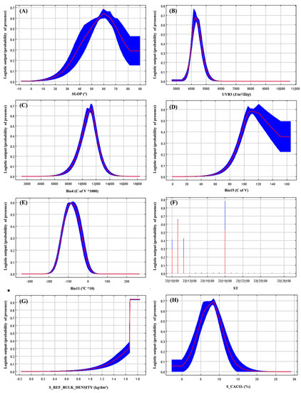 Response curves of the key environmental variables of the modeled distribution of Lonicera oblata based on the MaxEnt algorithm. (A) SLOP; (B) UVB3; (C) Bio4; (D) Bio15; (E) Bio11; (F) ST; (G) S_REF_BULK_DENSITY; (H) S_CACO3.