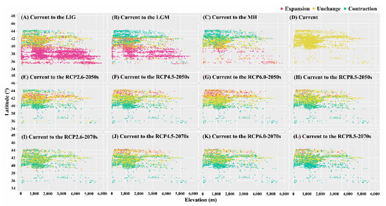 Altitude and latitude change of the suitable habitats of Lonicera oblata under different scenarios compared with the current condition. Each dot represents a grid cell in the suitable area data. Purple dots represent expansion, green dots represent contraction, yellow dots represent unchanged. (A) Current to the LIG; (B) Current to the LGM; (C) Current to the MH; (D) Current; (E) Current to RCP6.0-2050s; (F) Current to RCP4.5-2050s; (G) Current to RCP6.0-2050s; (H) Current to RCP8.5-2050s; (I) Current to RCP2.6-2070s; (J) Current to RCP4.5-2070s; (K) Current to RCP6.0-2070s; (L) Current to RCP8.5-2070s.