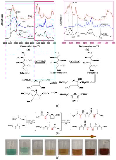 Schematic illustration of: (a,b) Infrared spectrum image of resin, (c) the reaction process of glucose isomerization-dehydration to form 5-HMF, (d) synthetic mechanism of linear glucose-urea-melamine (MUG) resin, (e) color change during resin synthesis.