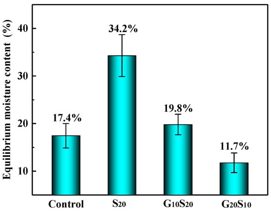 As shown in Figure 2. The EMC of S20 and G10S20 treated wood is 34.2% and 19.8%, which are 96.5% and 13.7% higher than that of the control, respectively. This is due to the strong hygroscopicity of inorganic sodium silicate, which makes the modified specimen easy to absorb moisture. The EMC of G10S20 and G20S10 treated wood is 42.1% and 65.7% lower than that of S20 treated wood, respectively, indicating that MUG resin can seal the hygroscopic groups of sodium silicate and wood to a certain extent and reduce its hygroscopicity. The EMC of the G20S10 treated wood is 11.7%, which is 32.7% lower than that of the control, indicating that as the MUG resin content increases to a certain extent, the moisture absorption problem of the treated wood can be effectively solved.
