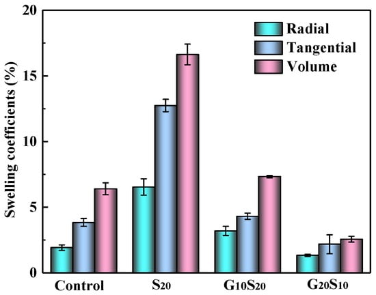 As shown in Figure 3. The swelling rates are all in order as S20 > G10S20 > W > G20S10, and all is volume > tangential > radial, which is consistent with the heterogeneous nature of the structure of wood itself. Table 2 shows that the ASE size of modified wood is G20S10 > G10S20 > S20, and the dimensional stability of G20S10 is significantly improved compared with the control. The more MUG resin in the compound modifier, the higher the dimensional stability of the modified wood. In summary, the volume ASE of G20S10 treated wood reached 60.01%. Compared with the studies of Yinluan et al., it was found that the improvement effect of G20S10 on the dimensional stability of poplar was similar to that of formaldehyde-melamine-urea (MUF) resin [39].