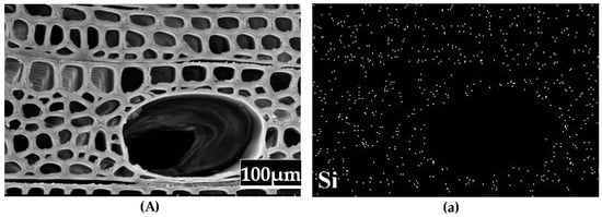 SEM-EDX image of the modified wood (A—cross section the untreated wood; B—cross section of G20S10 treated wood; C—longitudinal section of G20S10 treated wood; a, b, c—are the scanning distribution diagrams of silicon in A, B, and C, respectively).