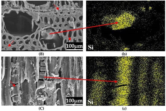 The porous hierarchical structure of wood helps it to absorb modified substances and improve the performance of wood. The internal structure changes before and after wood modification were observed by SEM and EDX, and the distribution and combination of MUG resin and sodium silicate in wood were explored to further analyze the modification mechanism. It can be seen from Figure 4 that the wood fiber cells, ray cells, and duct tissues of the control are all in a hollow state, and the energy spectrum scan shows that a small amount of Si is distributed in the cell wall of the control (Figure 4A,a). Some cell walls, cell lumens, intercellular space, and vessels of the G20S10 treated wood are attached or filled with columnar and granular solid substances (the red arrows in Figure 4B,C); compared with the control, the Si elements in the cell walls and vessels of the G20S10 treated wood increased significantly (Figure 4a,b). It shows that the compound modifier (G20S10) can effectively enter the characteristic pores of poplar wood cell walls. Through resin curing, the modifier can crosslink with the cell wall substances, wrap around the microfibrils, and deposit and fill in the wood voids. It effectively increases the ability of wood to resist external forces and reduce the moisture absorption sites and moving channels. The filling of wood pores and crosslinking with cell wall substances by resin are the main factors to improve the physical and mechanical properties of wood.