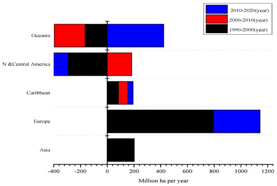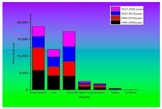 As depicted above in Figure 2, annually the forest area change in 1000 ha/yr from 1990–2000, 2000–2010, and 2010–2020 in the regions of Asia, Europe, the Caribbean, and Oceania show a positive enhancement of the forest region. Whereas Africa increased the reduction of forest area and North and Central America and South America are also decreasing forest area negatively.