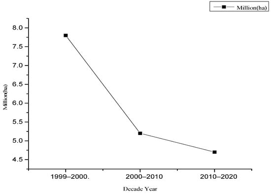 As illustrated in Figure 3, in some countries, the reduction in deforestation from 1990–2020 reduced the rate of net forest loss, significantly increasing forest areas, with increases in other areas through forestation and natural forest expansion. From a previous annual 7.8 million hectares loss, in the periods 2000–2010 and 2010–2020, forest loss decreased annually to 5.2 million hectares and 4.7 million hectares, respectively. Additionally, in the 1990–2000 decade, the net forest loss rate decreased. Owing to a reduction in the speed of forest production, the pace of the decrease in net forest depletion has slowed over the previous decade.