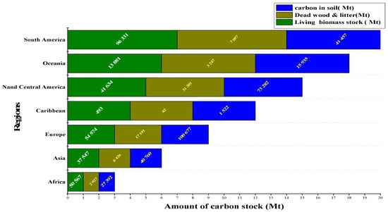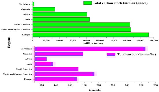As shown in Figure 6, in Europe, South America, North America, and Asia, the full stock of carbon in forests is highly significant (where the forest areas have increased) and it decreased significantly in Africa, Oceania, and the Caribbean. Around 1990, global forest carbon stocks decreased, and in 2020, for all pools, carbon stocks per hectare increased. By contrast, in all regions, per hectare biomass stock has increased except in Africa, Asia, and Europe between 1990 and 2020, where this attribute was relatively stable. So forests, particularly regarding the worldwide carbon cycle, play a key function and are considered critical and permanent sinks of carbon.
