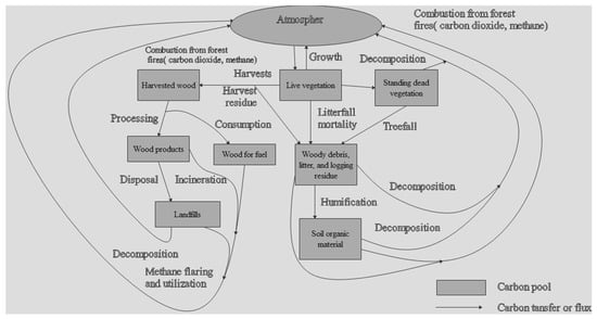 As per the IPCC (2003), biomass is comprised of five carbon ponds belonging to the terrestrial ecosystem, namely AGB, BGB, masses of dead litter, trees debris, and SOC. The CO2 fixed by plants is transferred via several carbon reservoirs during photosynthesis [111]. Carbon is over 50% of the dry tree biomass [112]. For example, the bark or any portion of a living or nonliving tree tissue such as branches, leaves, or roots. Carbon is located in the cells inside the plants’ cell walls in comparison to animal cells. Carbon is required to create compounds of lignin and cellulose and is therefore sequestered within the plant tissue. The mechanisms for photosynthesis use the sun, water, and CO2 for glucose and O2 development. CO2 is obtained from the atmosphere through the stomata (singular: stoma), small gaps in the epidermis of the plant (in particular, the leaves or stems) that are used to exchange gas for photosynthesis. When trees grow within the forest, so too does the biomass of the tree, and it sequesters more carbon. When the trees are growing and still young, net forest carbon intake is at its highest. While forests have the potential to sequester a large amount, they also release some CO2 back to the atmosphere. The result of cell respiration is CO2, a biological cycle found in plants and animals alike. In plants, the CO2 from cellular respiration can be recycled for photosynthesis but it returns some CO2 to the atmosphere at night, when no photosynthesis occurs. CO2 is also released into the atmosphere when debris or a dead tree (or some other vegetation) starts to break down.
