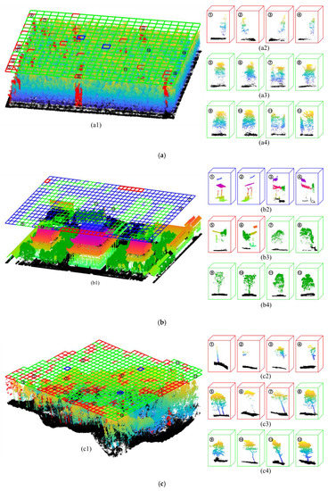 Recognition results of the partial LiDAR data belonging to the four forest plot types in our study sites using PointNet model: (a) nursery base, (b) monastery garden, (c) mixed forest, and (d) defoliated forest. A simplified representation using the upper rectangles in different colours represents the classification results of the point clouds below within each corresponding voxel, where the green, blue and red rectangles in (a1,b1,c1,d1) indicate that the point clouds under the rectangle within the voxel were recognized as trees, buildings and other objects, respectively. (a2–a4,b2–b4,c2–c4,d2–d4) show the zoomed classification results for the point clouds in some voxels.