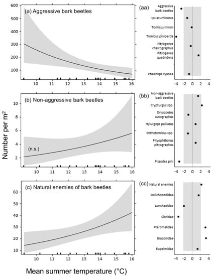 Relationships between mean summer temperatures and densities of (a) aggressive bark beetles and the buprestid P. cyanea, (b) non-aggressive bark beetles and the weevil P. pini, and (c) and natural enemies of bark beetles at different elevations as well as t-values (aa–cc). Negative t-values indicate negative association with temperature, and vice versa; the shaded areas indicate the 95% confidence bands (a–c) and the non-significant range (aa–cc) (p ≥ 0.05). The rug plots at the bottom of the graphs show the values measured in this study. Statistical details are given in Table S1.