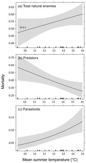 Relationships between mean summer temperatures and bark beetle mortality inflicted by (a) total natural enemies, (b) predators, and (c) parasitoids. The shaded areas indicate the 95% confidence bands. The rug plots at the bottom of the graphs show the values measured in this study. Statistical details are given in Table S1.