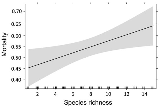 Relationship between total natural enemy species richness and bark beetle mortality. The shaded area indicates the 95% onfidence band. The rug plots at the bottom of the graph show the values measured in this study. Statistical details are given in Table S1.
