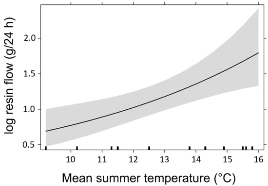 Relationship between resin flow and mean summer temperatures. The shaded area indicates the 95% confidence band. The rug plot at the bottom of the graph shows the values measured in this study. Statistical details are given in Table S1.