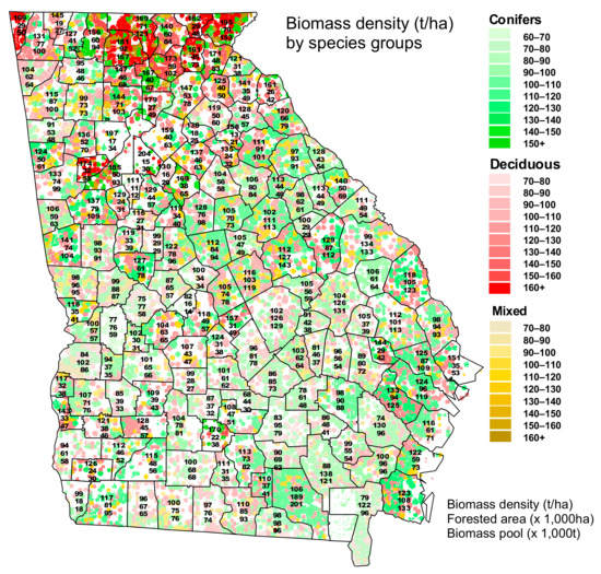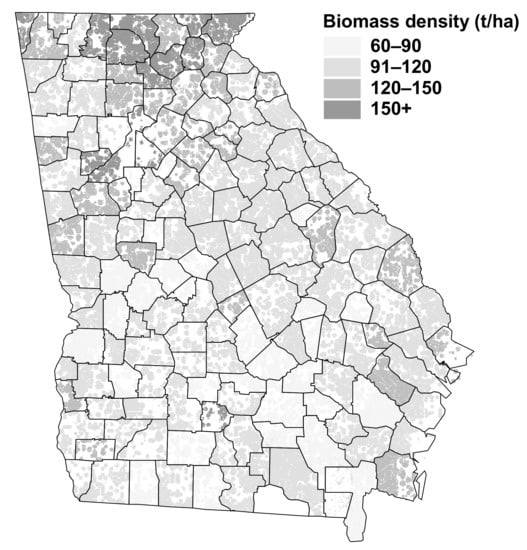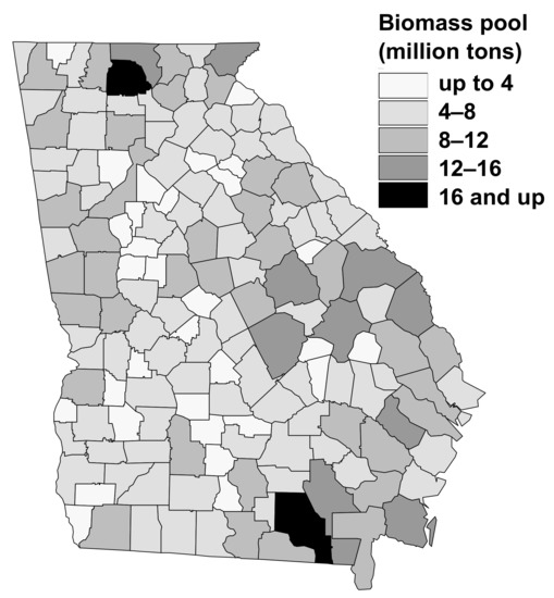 There are relatively few publications concerning the biomass resources of Georgia and other states in the southeastern United States. One of the most detailed analyses of the forest biomass resources in the United States, including individual states, is General Technical Report WO-57 by USDA Forest Service ([7]). All values with this report are expressed as dry biomass, so it is possible to use the presented results to directly estimate the amount of carbon. Another source is the paper by [8], which describes biomass in green pounds and contains detailed statistics of Georgia’s forest biomass by broad management classes, diameter distributions, forest types, etc. In 1998, the USDA Forest Service published more information about Georgia’s resources [9], but this report contains rather limited information regarding the estimation of biomass and carbon. Biomass analysis is a small part of this 1997 inventory report, which contains only one table with green biomass estimation by ownership class, species group, and tree component. Two more papers on the subject are [2] and [10]. The earlier one describes much broader information about carbon storage and accumulation in the United States forest ecosystems, with separate analyses for the eastern and western parts of the country. On the other hand, refs. [10,11,12] describe detailed analysis of quantity, and spatial distribution of dry biomass in forests of the eastern USA. These articles, which include consideration of data from Georgia, are based on the use of biomass expansion factors (BEF) applied to the Forest Inventory and Analysis (FIA) survey information from the 6th FIA forest survey of the eastern states that was concluded in 1989.