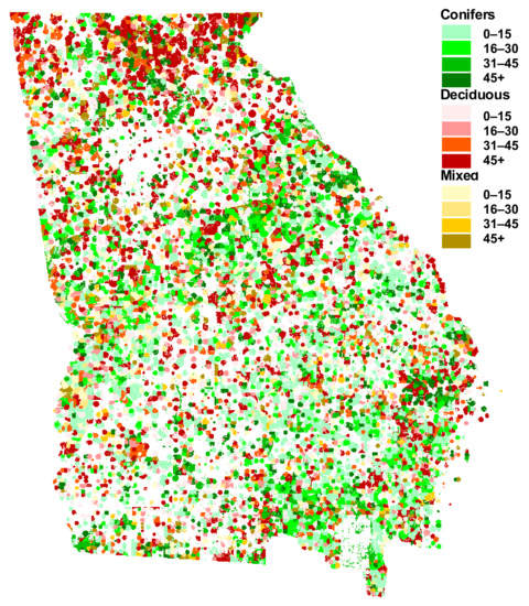 Finally, maps produced in this study allow for easy interpretation of the spatial biomass distribution in Georgia. Figure 4 shows the distribution of total biomass densities by forest types: coniferous, deciduous, and mixed, calculated at the plot scale of resolution. Coniferous forests with the highest total biomass density are located mostly in three regions: northern Georgia (Appalachian Highlands), the southern part of Piedmont, and the eastern part of Coastal Plain. Deciduous and mixed forests with the highest biomass density are concentrated mostly in the northern part of the state (especially in the Blue Ridge physiographic province), and in the western part of East Gulf Coastal Plain. Total dry biomass pools at the county level vary from 1.16 to 19.4 million tons, with an average of about 8 million tons (Figure 2). Counties with the highest biomass and carbon pools are primarily located on the eastern Coastal Plain. This relatively high density is the result of larger forest areas in this region relative to other areas of Georgia. Counties with the highest biomass density are located primarily in the northern part of the state, and counties with the lowest biomass density are located on the coast. Such a distribution of the biomass depends on at least two factors: species composition (forest types) and stand age (Figure 5). The highest densities are in deciduous and mixed forests, which, in addition to having the higher density, are also older than coniferous forests, and the lowest densities are associated with young, coniferous stands, most of which are very young plantations.