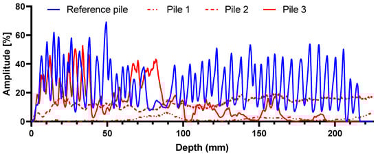 The structural health of the piles was assessed with resistograph and screw withdrawal force measurements. These measurements were carried out in situ. Resistance drilling is frequently used for decay assessment, but in the respective study, data were linked to chemical composition as well. It should be taken into account that the wood was saturated with water. It is well known that wood’s mechanical properties are significantly affected by moisture content (MC) []. However, increased MC is not the only reason for a decrease in mechanical properties. The blue curve in Figure 3 represents the typical resistograph curve. This reference curve was determined on a freshly cut Scots pine (Pinus sylvestris) representative beam []. MC of this beam was above fibre saturation to have comparable moisture conditions with wooden piles. The annual rings and the pith were resolved in the respective curves. The red curves in Figure 3 represent measurements taken on the piles. Three typical measurements are shown. Measurement one (Figure 3, pile 1) shows the pile where one part of the pile was severely degraded while the other part was less degraded. Although the heartwood of Scots pine has better durability than sapwood [,], no difference was found between the degradation rate of sapwood and heartwood. However, as shown in the other resistograph measurements (Figure 3, piles 1 and 2), all piles’ parts were significantly degraded. As can be seen from resistograph measurements, pile 3 was less degraded. As the piles were located in comparable conditions, we could not determine the reasons for this difference. The key reason is presumably heterogeneity of the wood used and variations in micro-locations. It should be considered that piles were not in direct contact with each other.