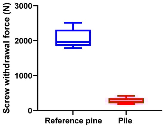 Resistograph measurements were in line with the screw withdrawal force (SWF) measurements. The SWF determined on the reference pine beam was 2060 N, while the SWF determined on wooden piles was only 272 N (Figure 4). This value was about 13% of the value determined on fresh wood. Both methods, resistograph and SWF, indicate that the wood was significantly degraded. However, it should be considered that the measurements were made on the upper part of the wooden piles. Literature data indicate that the upper parts are more exposed to biodegradation than the part of the piles deeper in the soil []. It can therefore be assumed that the worst part of the piles was analysed.
