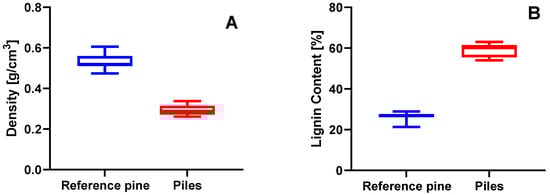 The decay of the piles was also confirmed visually. When isolated, the colour of the wood was white, and after a few minutes, it became grey. The wood had a fibrous, spongy texture, with no distinct odour. Cutting was easy, and the wood did not present much resistance. Decay is usually reflected in density, especially since the wood was saturated with water and carefully dried to prevent collapse before densities were determined. The density of the reference pine was 532 kg/m3. This value is in line with literature data []. However, the density of the wood from the piles was significantly lower. The average density of the wood from the piles was 296 kg/m3 (Figure 5A). This confirms that the piles were highly degraded. Chemical analysis confirmed the results obtained by the other methods of investigation. The lignin content in the pinewood was 26.7% (Figure 5B). However, due to the general depletion of cellulose and hemicelluloses [], the piles’ relative lignin content increased (58.8%). These values are still slightly lower than the lignin content in the Bronze Age piles from a nearby location. The lignin content in 4500- to 5700-year-old Bronze Age piles ranged from 63.8% to 70.3% []. The pH of the degraded wood was 7.1 and corresponded with the pH of the surrounding soil []. On the other hand, the pH of reference Scots pine sapwood (pH = 4.68) and heartwood (pH = 5.02) was considerably lower. Scots pine pH values were in line with literature data [].