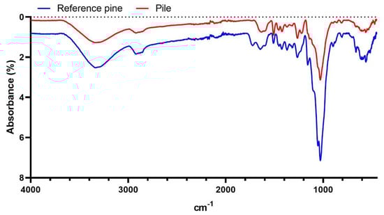 FTIR spectra of pine pile and reference Scots pine sapwood.