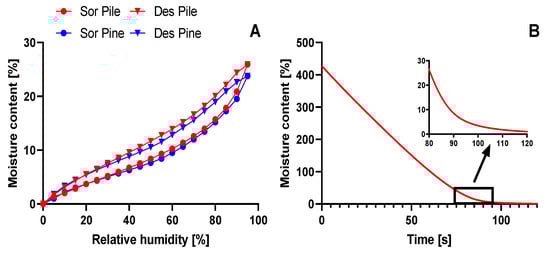 (A) Sorption (Sor) and desorption (Des) curves of pine pile and reference Scots pine sapwood. (B) Drying pattern of the fresh pile sample.