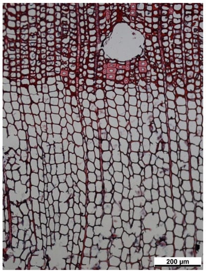 Light microscopy was performed on specimens oriented in all three anatomical planes and containing at least one tree ring. The specimens were dehydrated in a graded ethanol series (70, 90, 95, and 100%), cleaned with D-limonene, and embedded in paraffin blocks (tissue processor Leica TP1020-1, Nussloch, Germany). Thin sections (9 μm thick) were cut using a semi-automatic rotary microtome RM 2245 (Leica, Nussloch, Germany), stained with a safranin and astra blue solution and mounted in Euparal (Gladwick St, Compton, CA 90220, USA). Slides were observed under a Nikon Eclipse 800 light microscope and photomicrographs were taken by a digital camera (DS-Fi1) connected to a NISElements BR 3 image analysis system (Melville, NY, USA).