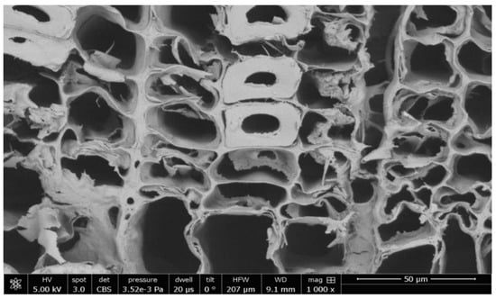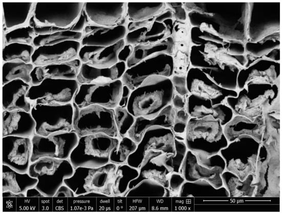 Scanning electron microscopy image of the cross-section of the latewood cells of the wooden pile.