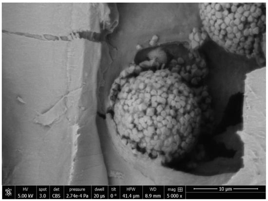 Although no bacteria were detectable in the degraded wood, we noted several spherical structures in the wood cell walls (Figure 11). EDX analysis of the crystals confirmed the presence of sulfur, iron, and calcium. Chemical analysis of the crystals showed that these structures could be of bacterial origin []. This process is known as biomineralisation, the chemical alteration of an environment by microbial activity leading to minerals’ precipitation. The most important bacteria associated with biomineralisation belong to the Bacillus sp. and Lysinibacillus sp. More than 60 different biological minerals have been reported as a result of biomineralisation []. However, these minerals are not an explicit confirmation of bacterial decay, but an indication that the bacteria were somehow involved in the respective piles’ degradation.