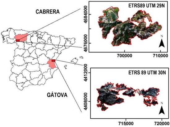 We selected two study sites affected by wildfires in summer 2017: the Cabrera mountain range in León province (NW Iberian Peninsula) and Gátova, located in the Calderona mountain range, Valencia province (SE Iberian Peninsula) (Figure 1).