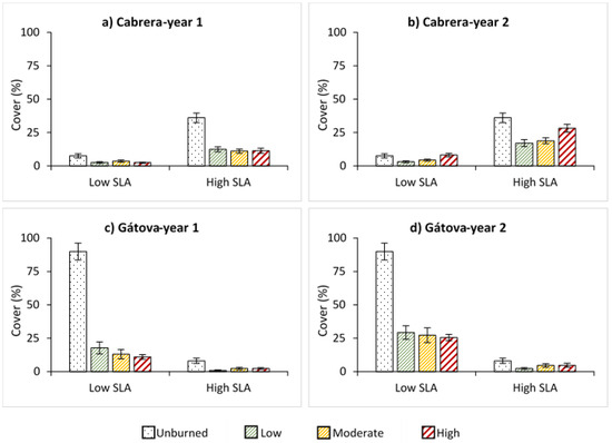 Average cover (%) of species with low and high specific leaf area (SLA), and standard error for each burn severity level (unburned, low, moderate, and high) measured by the composite burn index (CBI) in: (a) Cabrera, one year post-fire; (b) Cabrera, two years post-fire; (c) Gátova, one year post-fire; and (d) Gátova, two years post-fire. Statistical information is provided in Tables S3 and S4 (Supplementary Material).