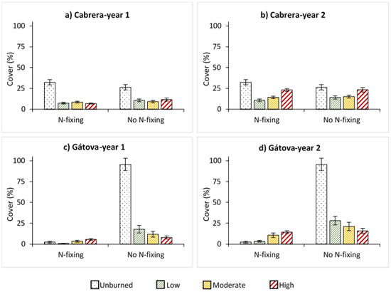 Average cover (%) of species with N2-fixing and no N2-fixing capacity, and standard error for each burn severity level (unburned, low, moderate, and high) measured by the composite burn index (CBI) in: (a) Cabrera, one year post-fire; (b) Cabrera, two years post-fire; (c) Gátova, one year post-fire; and (d) Gátova, two years post-fire. Statistical information is provided in Tables S3 and S4 (Supplementary Material).