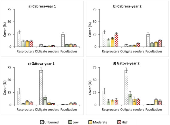 Average cover (%) of resprouter, obligate seeder, and facultative species, and standard error for each burn severity level (unburned, low, moderate, and high) measured by the composite burn index (CBI) in: (a) Cabrera, one year post-fire; (b) Cabrera, two years post-fire; (c) Gátova, one year post-fire; and (d) Gátova, two years post-fire. Statistical information is provided in Tables S3 and S4 (Supplementary Material).