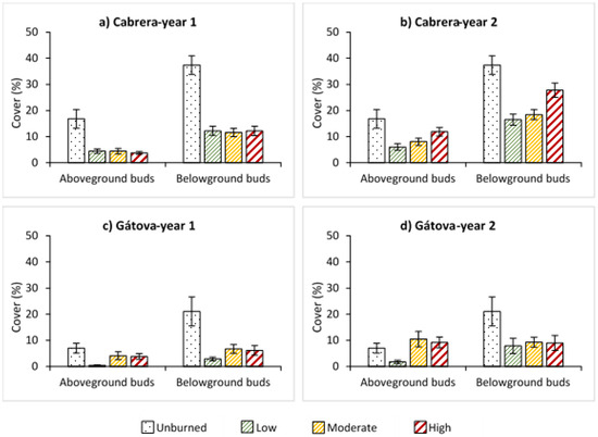 Average cover (%) of species with aboveground and belowground buds, and standard error for each burn severity level (unburned, low, moderate, and high) measured by the composite burn index (CBI) in: (a) Cabrera, one year post-fire; (b) Cabrera, two years post-fire; (c) Gátova, one year post-fire; and (d) Gátova, two years post-fire. Statistical information is provided in Tables S3 and S4 (Supplementary Material).