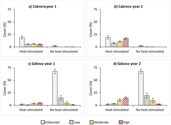 Average cover (%) of species with heat-stimulated and no heat-stimulated germination, and standard error for each burn severity level (unburned, low, moderate, and high) measured by the composite burn index (CBI) in: (a) Cabrera, one year post-fire; (b) Cabrera, two years post-fire; (c) Gátova, one year post-fire; and (d) Gátova, two years post-fire. Statistical information is provided in Tables S3 and S4 (Supplementary Material).