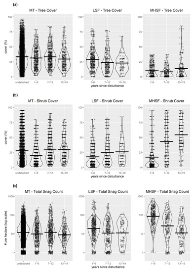 We used standardized five-minute unlimited-distance point count surveys [72,73] to sample the avian community during the peak of the breeding season. At each survey station, we recorded all birds detected (visually or audibly) and estimated their distance to the nearest 1 m from the observer. We visited each station up to twice between 1 May and 15 July in 2010 through 2017, and in 2019. Our field survey project received reduced funding starting in 2017, and we only surveyed half the full sample in 2017 and 2019 and no locations in 2018. The average number of visits per station was 11.9 across the nine years of surveys, or 1.6 surveys per year per point count station. We completed counts within four hours of sunrise and did not survey during inclement weather. Prior to conducting point counts, all observers completed an intensive two-week training program and passed a double-observer field test of bird identification. At each station, we characterized the vegetation within 50 m of the survey plot center using visual estimates of the percentage of the plot that was covered by trees and shrubs (shrub cover includes all understory woody vegetation species), counted standing snags >10 cm diameter, and measured structural characteristics, including the live-tree basal area using a 10-factor key from at least three locations within the survey plot [65]. These relevé vegetation surveys were conducted up to three times at each point count station across the 10-year time span of bird surveys. We used the vegetation measurements to characterize the progression of vegetation change over time within each treatment type and used violin plots [74] to show changes over time within each treatment category, including the mean values of each subsample.