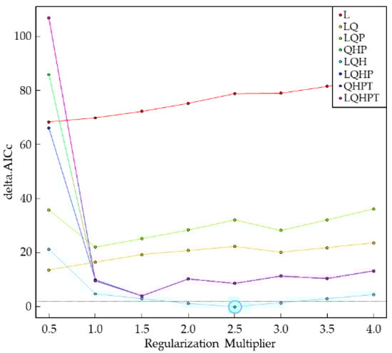 The FC combination of the maximum entropy model in this study was LQH and the ‘RM’ was 2.5 (Figure 1).