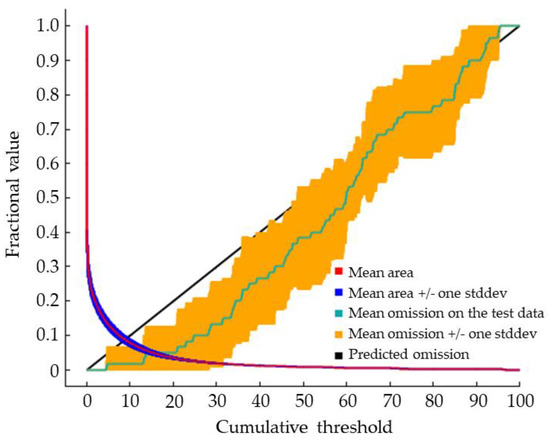The following parameters were also used in the model analysis. We used random seed, which is similar to bootstrapping, where each run will use a different random seed. The random test percentage was set to 25, which means that 75% of the occurrence points are randomly selected as the training set, and the remaining 25% are used as the test set. We used ArcMap software, DIVA-GIS software v7.5.0 (https://www.diva-gis.org/), and R software v4.0.3 (https://www.r-project.org/) to calculate the ‘Regularization multiplier’ (RM). The R packages used were ENMeval, dismo, dotCall64, fields, grid, knitr, maps, maptools, raster, rgeos, sp, spam, and spThin, to calculate the RM and feature classes (FC). The RM was set to 0.5, 1.0, 1.5, 2.0, 2.5, 3.0, 3.5, and 4.0. The FC included linear (L), quadratic (Q), hinge (H), product (P), and threshold (T). The ENMeval package was used to calculate the corrected Akaike information criterion correction value (AICc value) under different parameters. AICc value was used to estimate the complexity of the maximum entropy model, with the smallest AICc value corresponding to the FC combination and preferred RM [54]. We tested eight different FC combinations, including L, LQ, LQP, QHP, LQH, LQHP, and LQHPT [24,55,56]. The “checkerboard2” method was used to calculate the AICc value. The model was run ten times (replicates set to 10) under the same setting, with the final result presented as the average of the replicates.