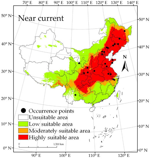 Current occurrence and distribution of S. nitobei in China, and the predicted area suitability under the near current climate condition. S. nitobei has the potential to occupy over 60% of the land area of China, which shows high suitability for occurrence of S. nitobei.