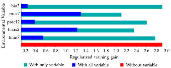 Jackknife analysis result showing most important environmental variables predicting potentially suitable distribution areas of S. nitobei in China. Monthly precipitation in July and maximum temperature in February significantly contributed to explaining the suitability of the area, with monthly precipitation in July and isothermality having the most unique information predicting area suitability for S. nitobei.