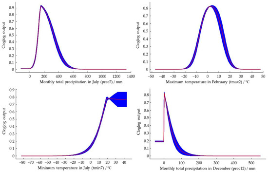 Response curves between the distribution probability of S. nitobei and environmental variables. Values shown are average over 10 replicate runs: blue margins show ± SD calculated over 10 replicates.